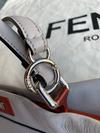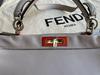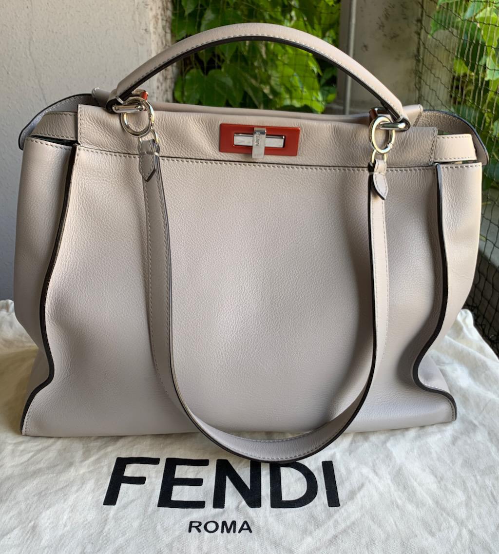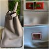 Calfskin leather in grey with polished silver hardware. The bag features a rolled top handle, a detachable leather shoulder strap with silver links (32 cm drop) with latch fastener, and opens to a partitioned interior with a dual turn lock closure. One inside zip pocket, inside logo plaque